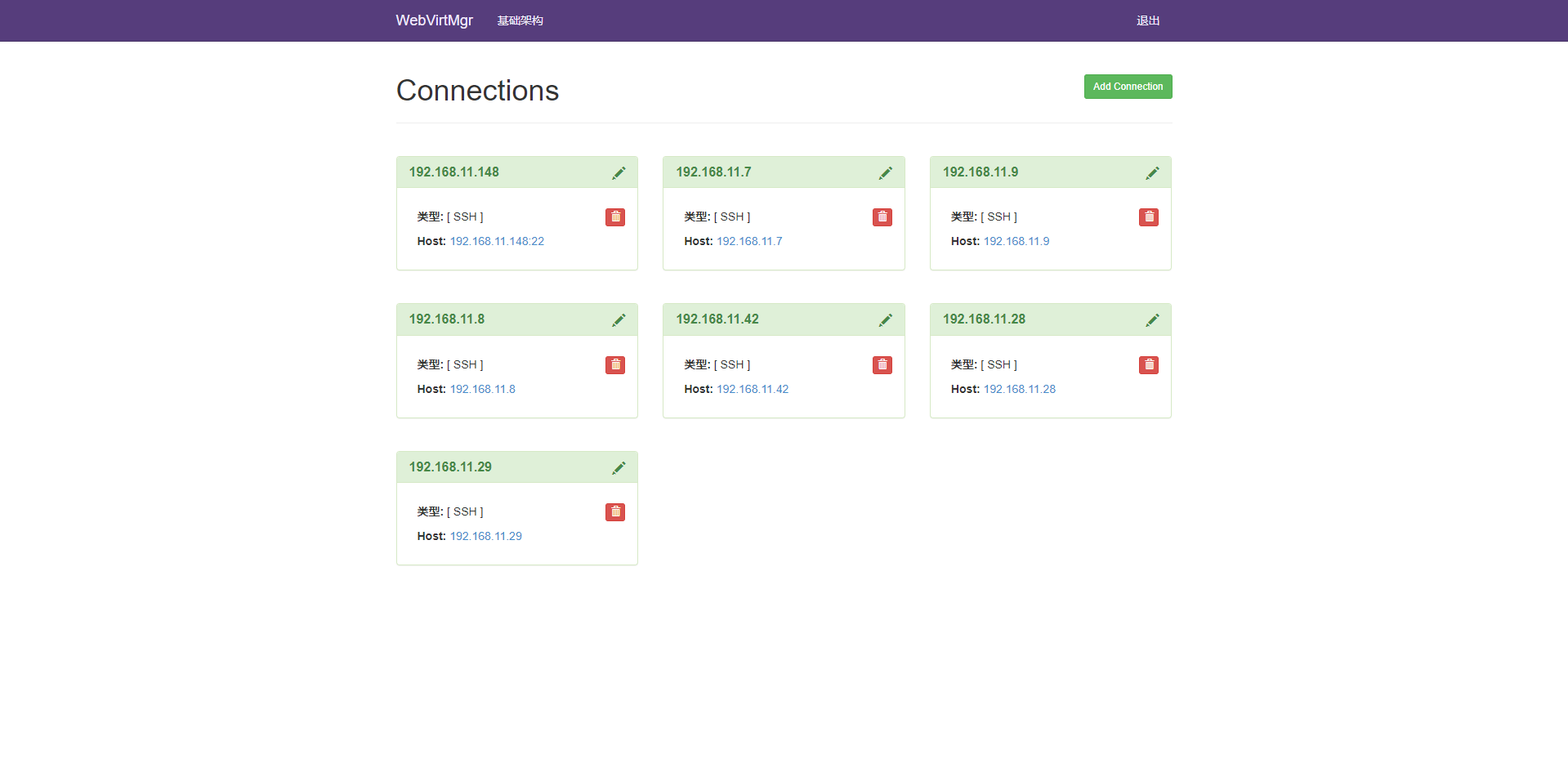 然后点击右上角添加一个 Add connection,把 localhost 这个 libvirtd 的链接用 tcp 的方式添加进去,用户名和密码是刚才初始化的 libvirt 的管理员 admin 和密码,链接如果能够正常添加的话,表明可以正常运行了。
